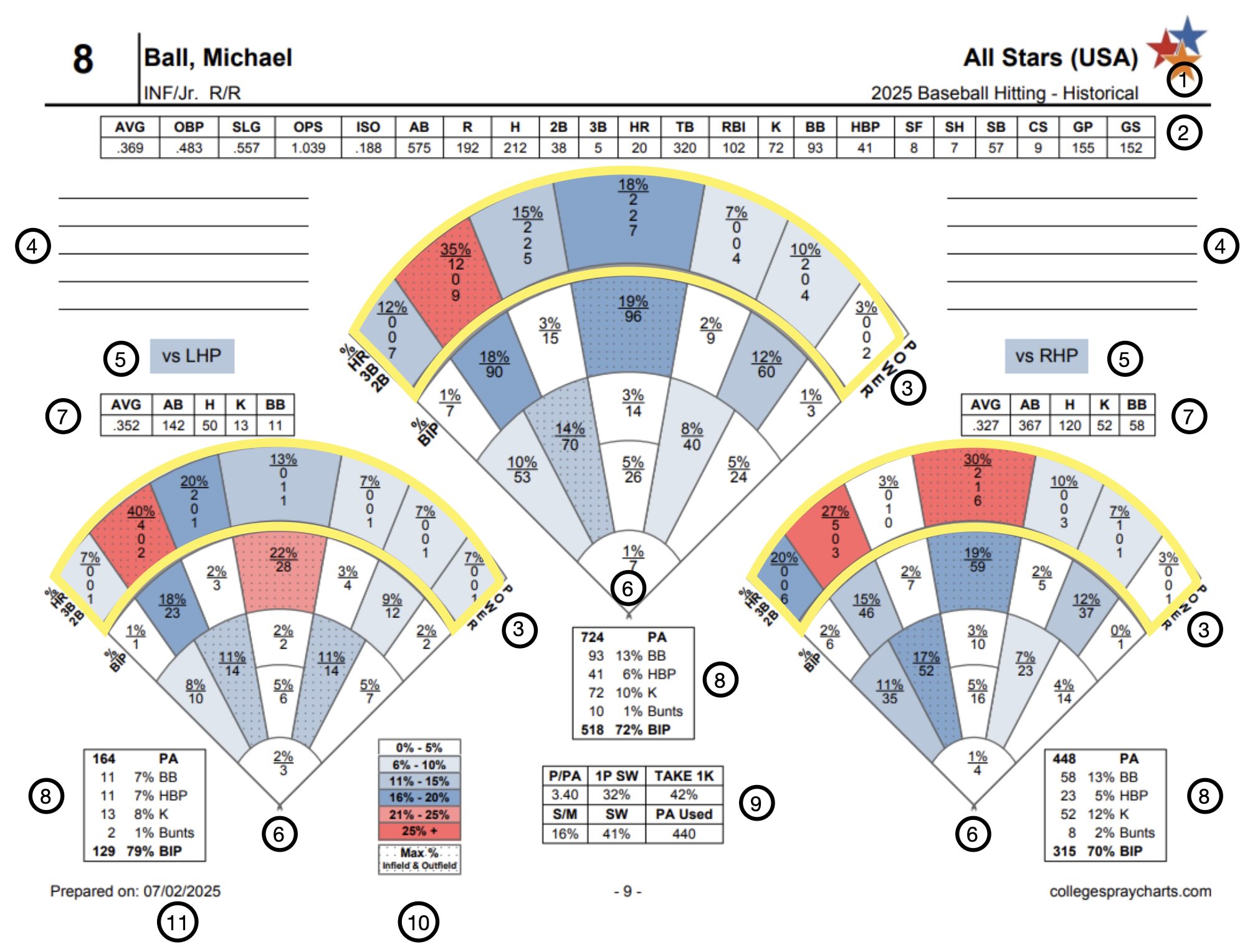 The information used to produce the charts is derived from the play-by-play information from the box scores (The play-by-play information only gives the location of where the ball was put into play and not the distance it was hit). With my experience as a software developer I have come to develop highly accurate charts that provide you with the latest information on your opponent.