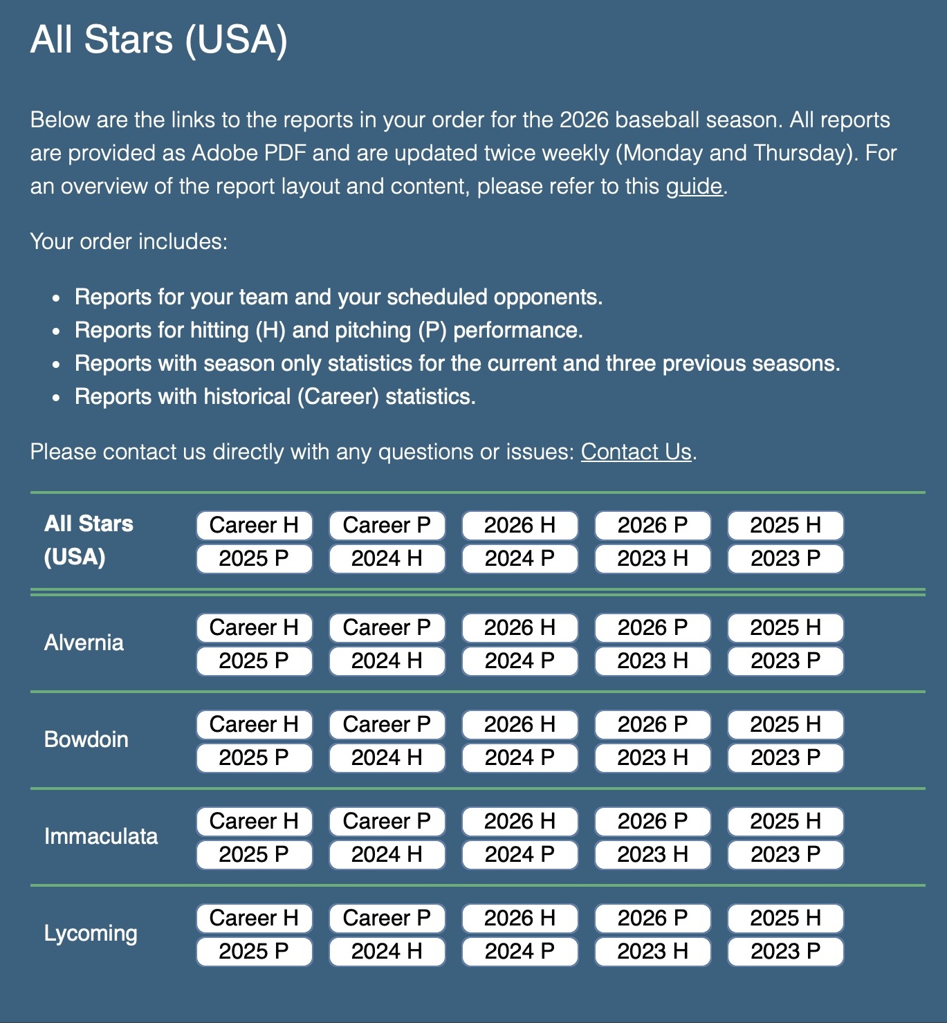 The reports include data and analytics for both pitching and hitting. Check out this guide for the details. Also, most reports include at least 4 years of compiled play-by-play information with new games added twice weekly (Monday & Thursday).